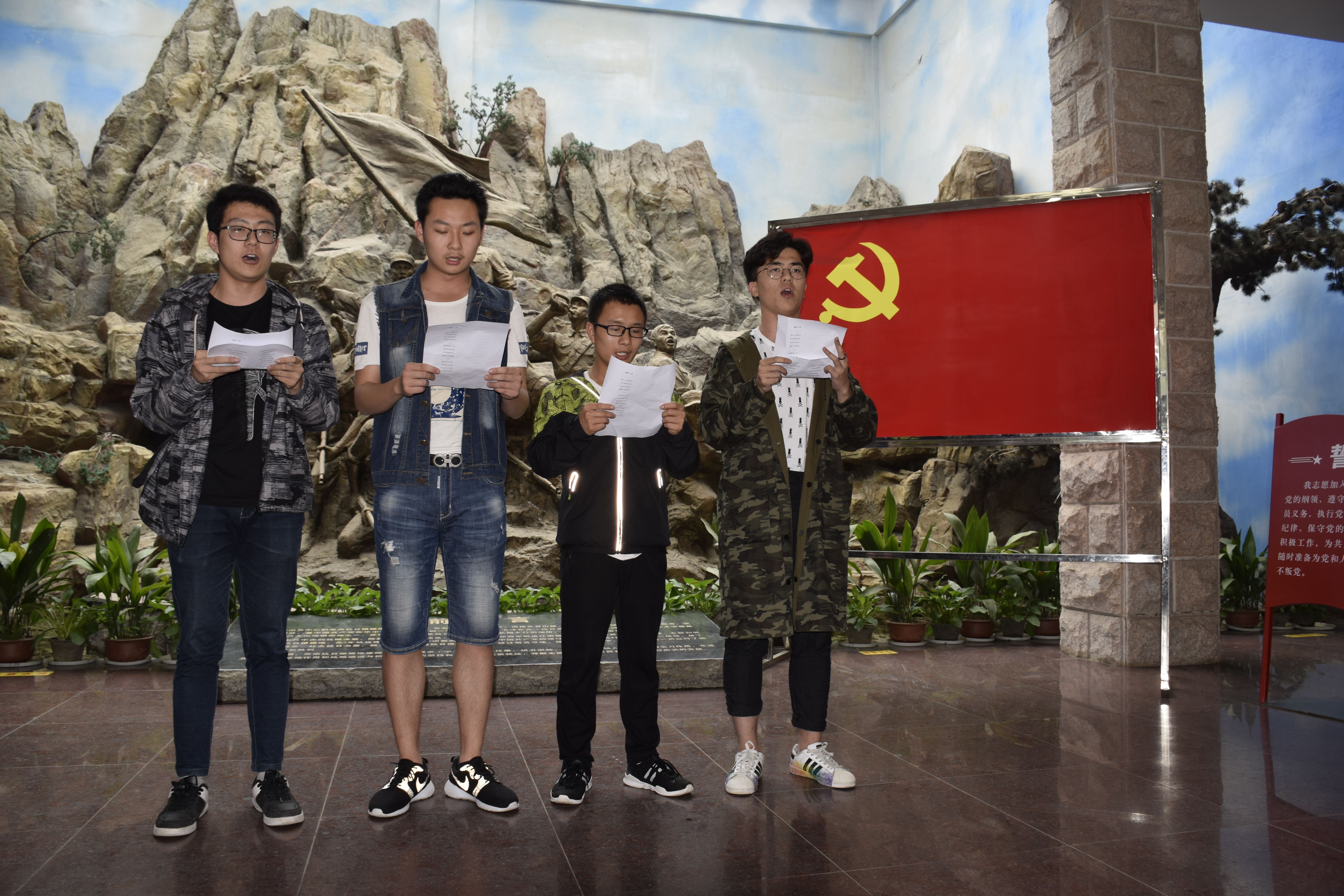 下午,机电师生在纪念馆大厅展开了五四诗会的活动,2015级本科生党支部的19名即将转正的预备党员,分小组朗诵毛主席的诗词。同学们慷慨激昂的朗诵着毛主席那脍炙人口的诗词,体会着一代伟人的精神风貌,从“鲲鹏击浪从兹始”到“恰同学少年,风华正茂”,领略到了毛主席“唤起工农千百万”的雄伟气魄,“三军过后尽开颜”的喜悦。“数风流人物,还看今朝”!我们应当谨记一代伟人的教诲:一万年太久,只争朝夕。最后大家前往苏南抗日战争胜利纪念碑,聆听感受“纪念碑前放鞭炮,纪念碑下听军号”的奇观,瞻仰陈毅、粟裕骑马征战的雕像,在纪念碑前献花鞠躬,以表达对先烈的缅怀和敬仰。