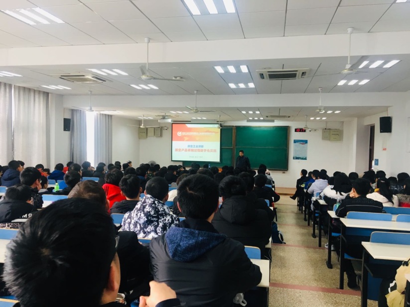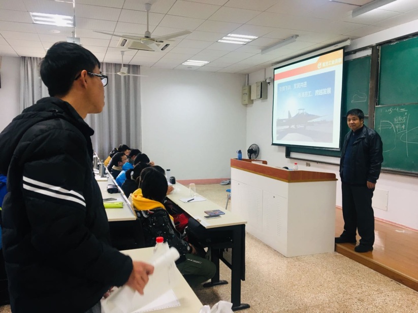 宋总在介绍洪都航空工业集团发展历史和历年航空人为航空事业所做成绩的基础上,向对飞机制造尚懵懵懂懂的大一学生解说了航空厂飞机设计与制造的过程,用实例阐述了数字化技术在飞机设计制造中的应用,以及智能制造在航空厂的发展现状和趋势,宋总讲述清晰,辅以实例说明,现场不时响起同学们的热烈的掌声。