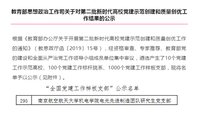 12月12日,教育部思想政治工作司公示了第二批新时代高校党建示范创建和质量创优工作结果,机电机电学院极速赛车计划/ 玩法规则 极速赛车计划/ 玩法规则 首个在课题组建立的纵向党支部——电光先进制造团队研究生党支部荣获“全国党建工作样板支部”。