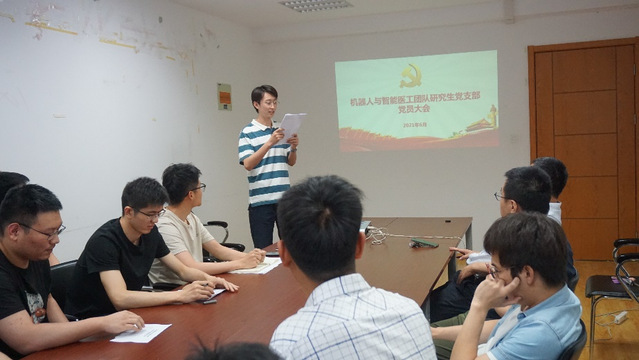 6月4日下午,中共极速赛车玩法 机器人与智能医工团队研究生党支部第一次党员大会在明故宫校区A17号楼召开。机器人与智能医工团队的陈柏老师、王灵禺老师、刘凯老师、鞠锋老师、姚佳烽老师、吴青聪老师、王旦老师以及团队全体研究生党员参加了本次会议,会议由机器人与智能医工团队研究生党员常天佐同志主持。