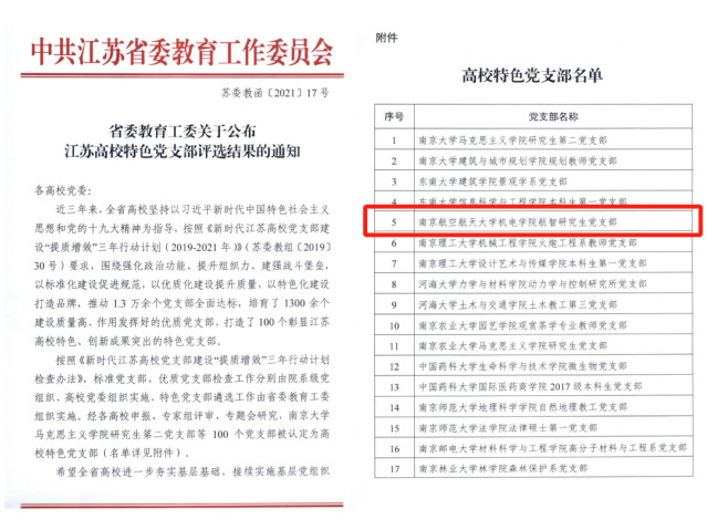 6月16日,江苏省委教育工委下发了关于江苏高校特色党支部评选结果的通知,决定授予100个高校党支部“江苏省高校特色党支部”称号,极速赛车玩法 航智研究生党支部成功入选。