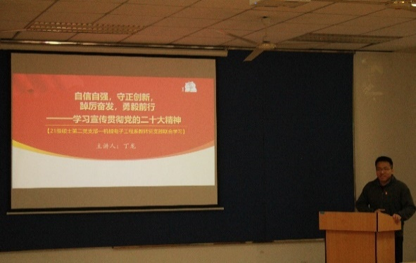 活动开始,2021级硕士第二党支部书记丁龙从“学习报告划重点”、“直击报告关注点”、“谈谈报告感悟点”三个部分领学了党的二十大报告。通过解读报告中出现的数字,让党员同志们感受新时代的伟大变化;通过讲述我国航空科技史中的南航力量,鼓励支部成员科研攻关,献身国防。