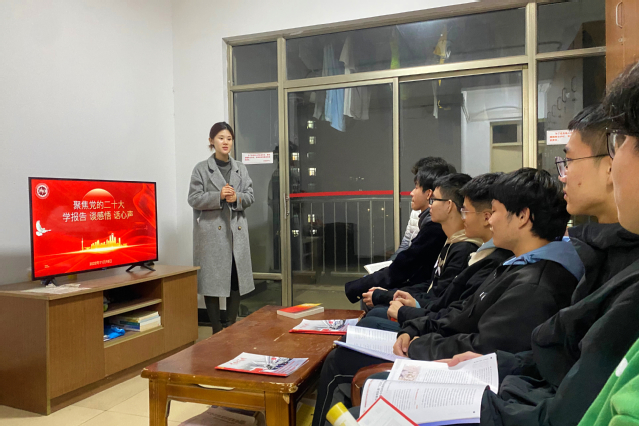 团学骨干们以“学报告、谈感悟、话心声”为主题,学习党的二十大报告,并从自身学习和工作实际出发分享心得体会。辅导员聂敏敏就“新时代青年的使命与担当”话题,鼓励同学们要充分认识学习党的二十大精神的重大意义,勇于做走在时代前列的奋进者、开拓者、奉献者,把奋斗精神体现在做好每一件小事、完成好每一项任务、履行好每一项职责的实际行动中。