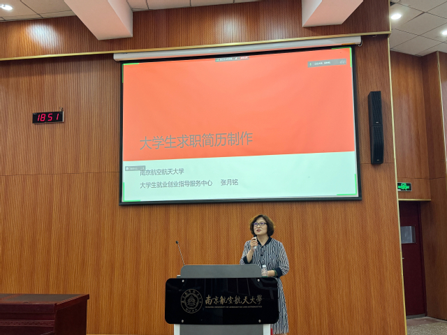 培训中,张月铭结合HR筛选简历的“鸭子理论”以及企业需求,引导同学们在制作简历前做好“思考自己”“思考环境”“了解企业”“行动”这四步,确定个人职业方向和岗位。她从简历的“个人信息”“教育背景”“实习实践”“荣誉奖励”“个人技能”等内容展开介绍,帮助同学们梳理了简历撰写的关键要素和注意事项。