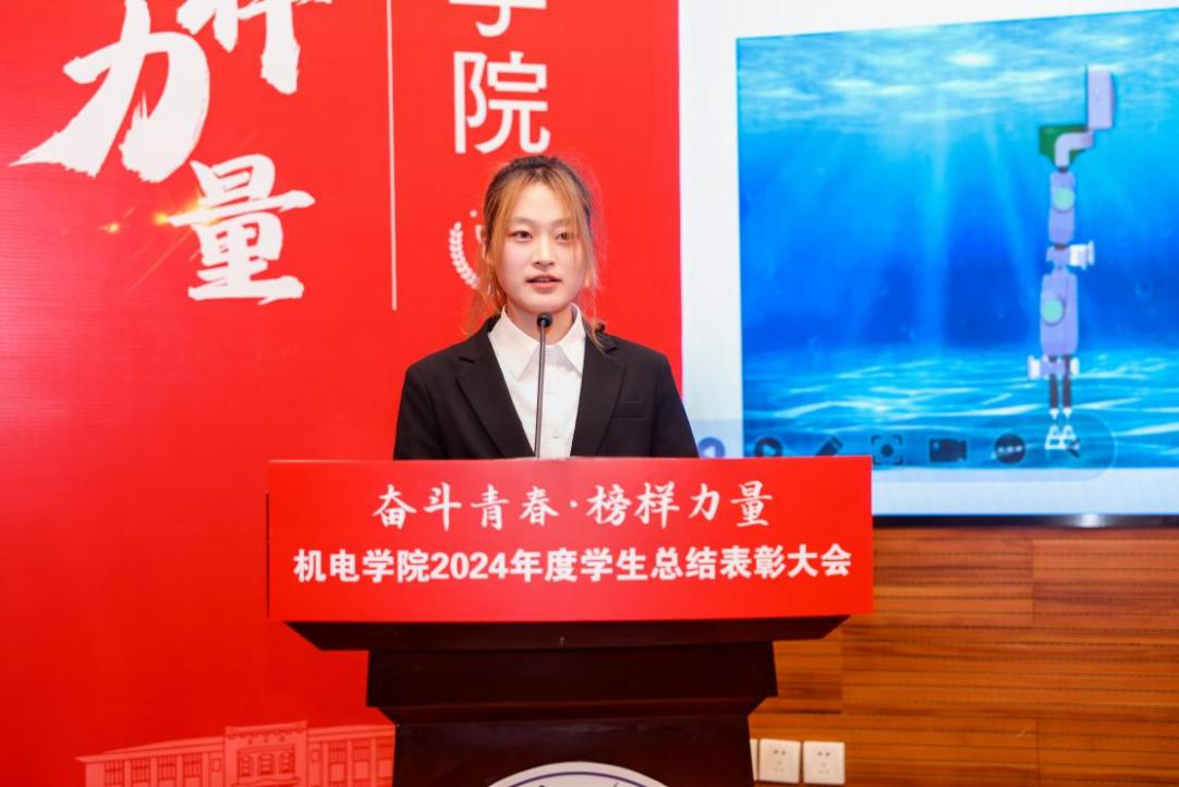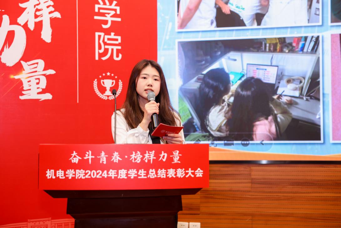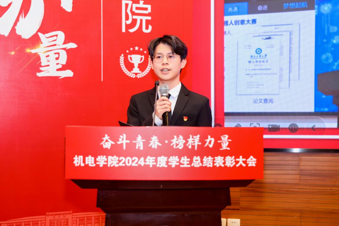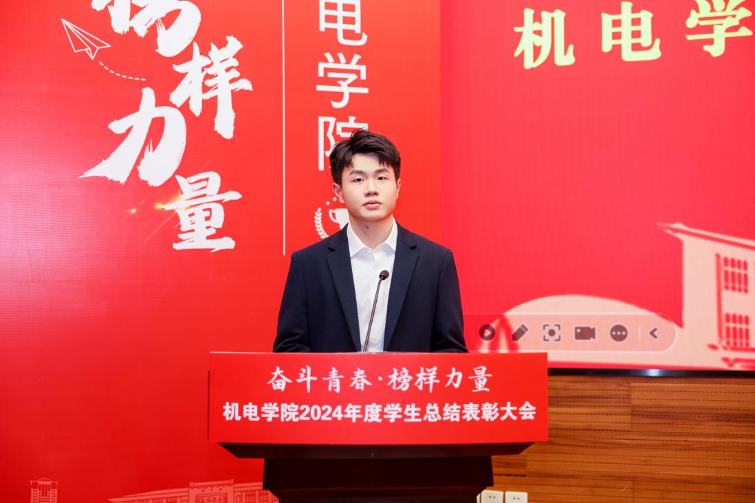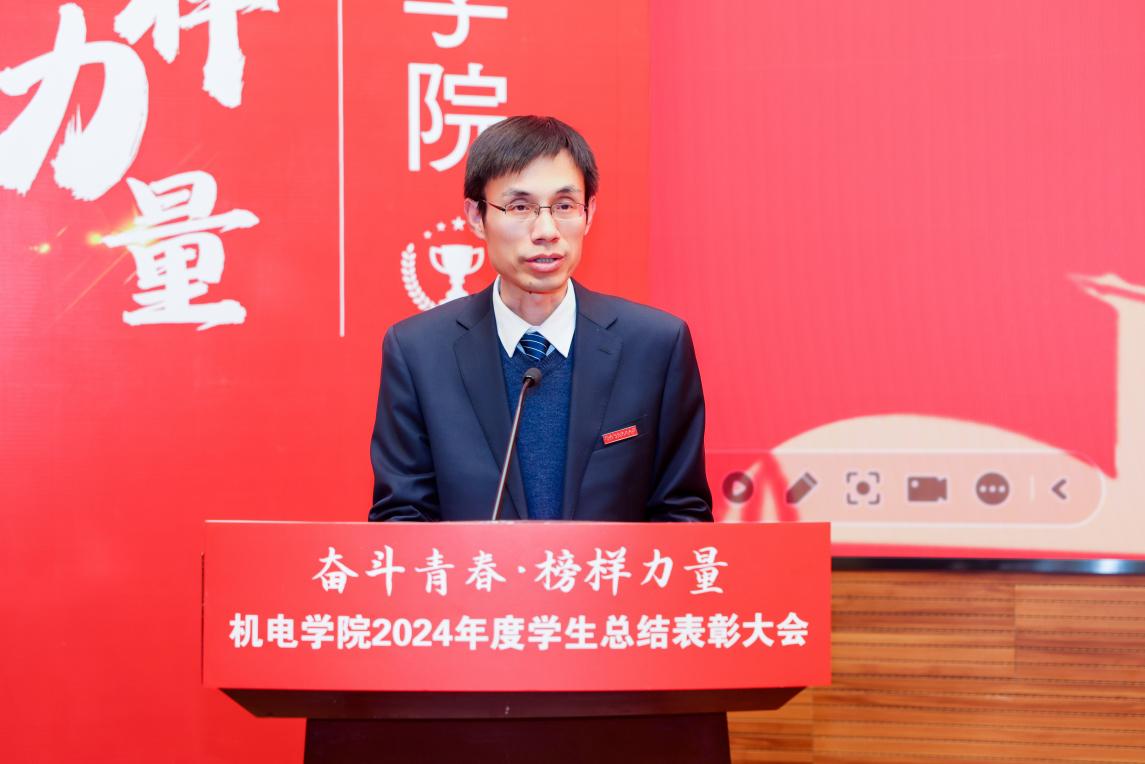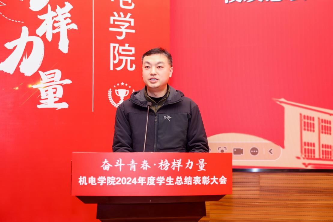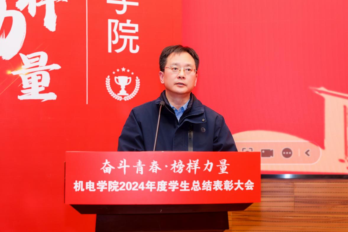 最后,刘虎对本次表彰大会致辞。他表示,今天的表彰大会,不仅是一场朋辈引领的榜样事迹分享会,更是一堂筑梦育人的思政公开课。他对同学们提出了三点要求:要坚定理想信念、厚植家国情怀,要坚持科技创新、练就过硬本领,要矢志拼搏奋斗、勇担时代重任。他强调,新时代呼唤新作为,新征程须有新担当,希望机电学子在推进强国建设、民族复兴伟业中展现青春作为、彰显青春风采、贡献青春力量。