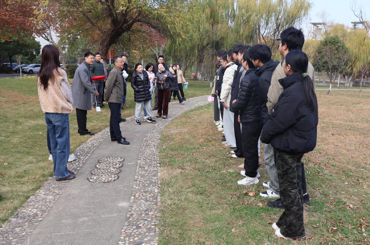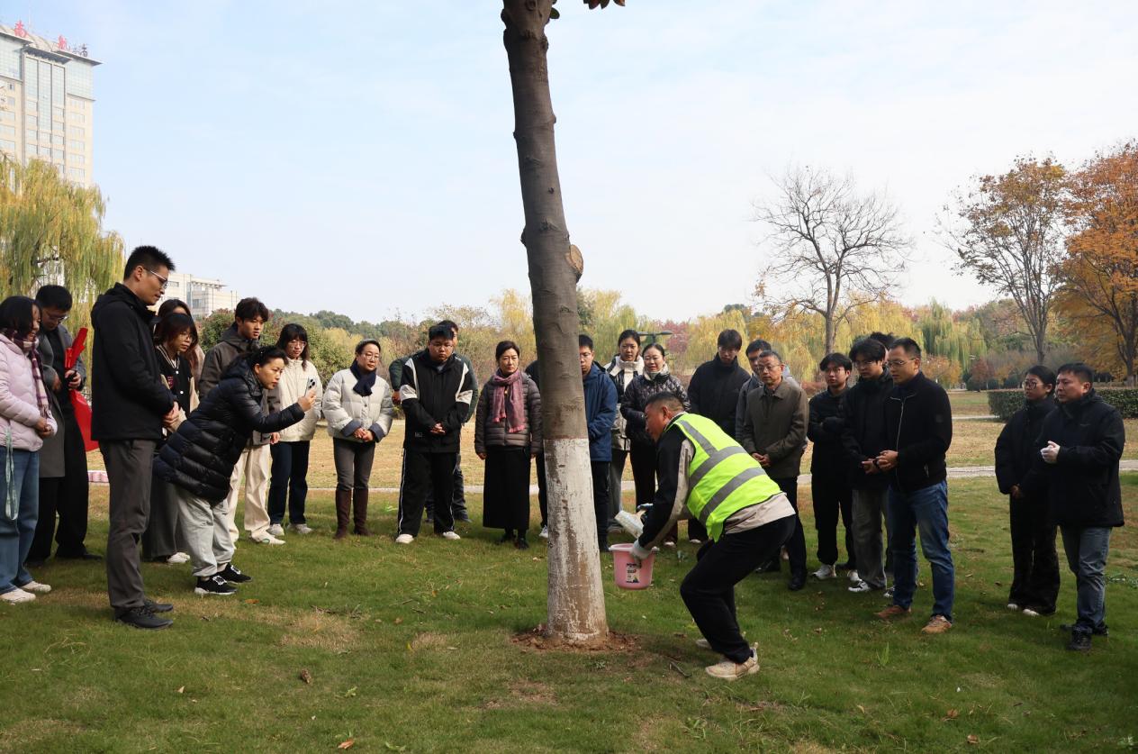 在实践环节,后勤保障部校园服务中心副主任蒋超为师生讲解树木刷白的科学作用,包括防寒抗冻、防治病虫害等,并由校内专业养护人员现场进行了刷白示范,展示了正确的操作手法和注意事项。